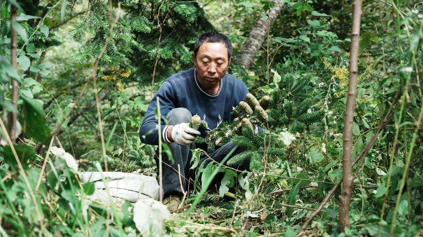 在八茨线附近山林天源国际,秦岭冷杉树干高大挺拔,赤果在微风中微微颤动。工作人员系上安全绳,麻利地爬上树梢,用刀具将带有赤果的枝头截断,随后将坠落在地上的果实捡拾到一起,进行装袋。